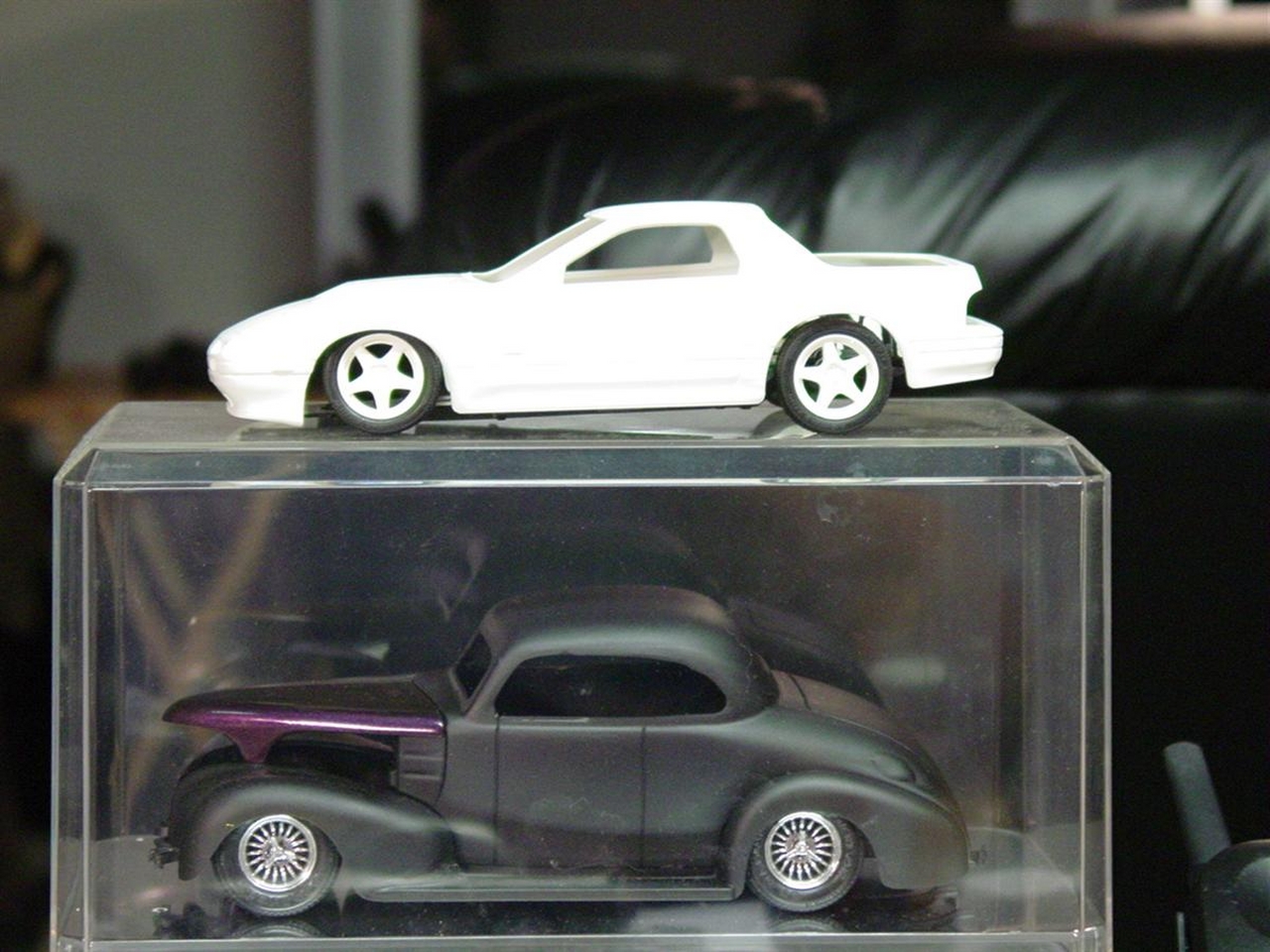 This was a kit that at one point in time was a motorized model kit.  The side effect of this option is a poorly detailed chassis.  It bothered me enough that I never thought I would do anything with this kit.  I had completed most of the body work and painted it flat black and just let it sit.  I don’t remember how I did it, but at one point in time, I broke the front window piece.  With a trashed window and a poorly detailed chassis, I just let it sit.  The more I looked at it in flat black, the more I liked the way it looked.  All I needed to do to finish this kit was detail paint the lights and wheels.