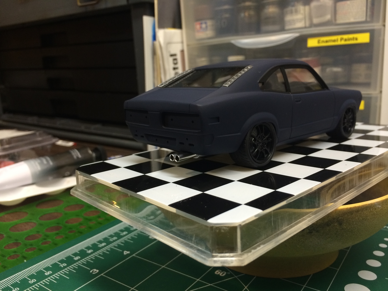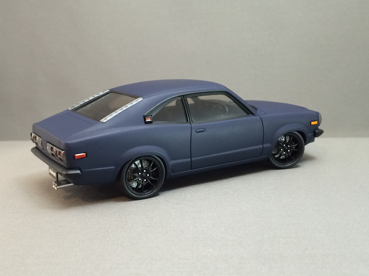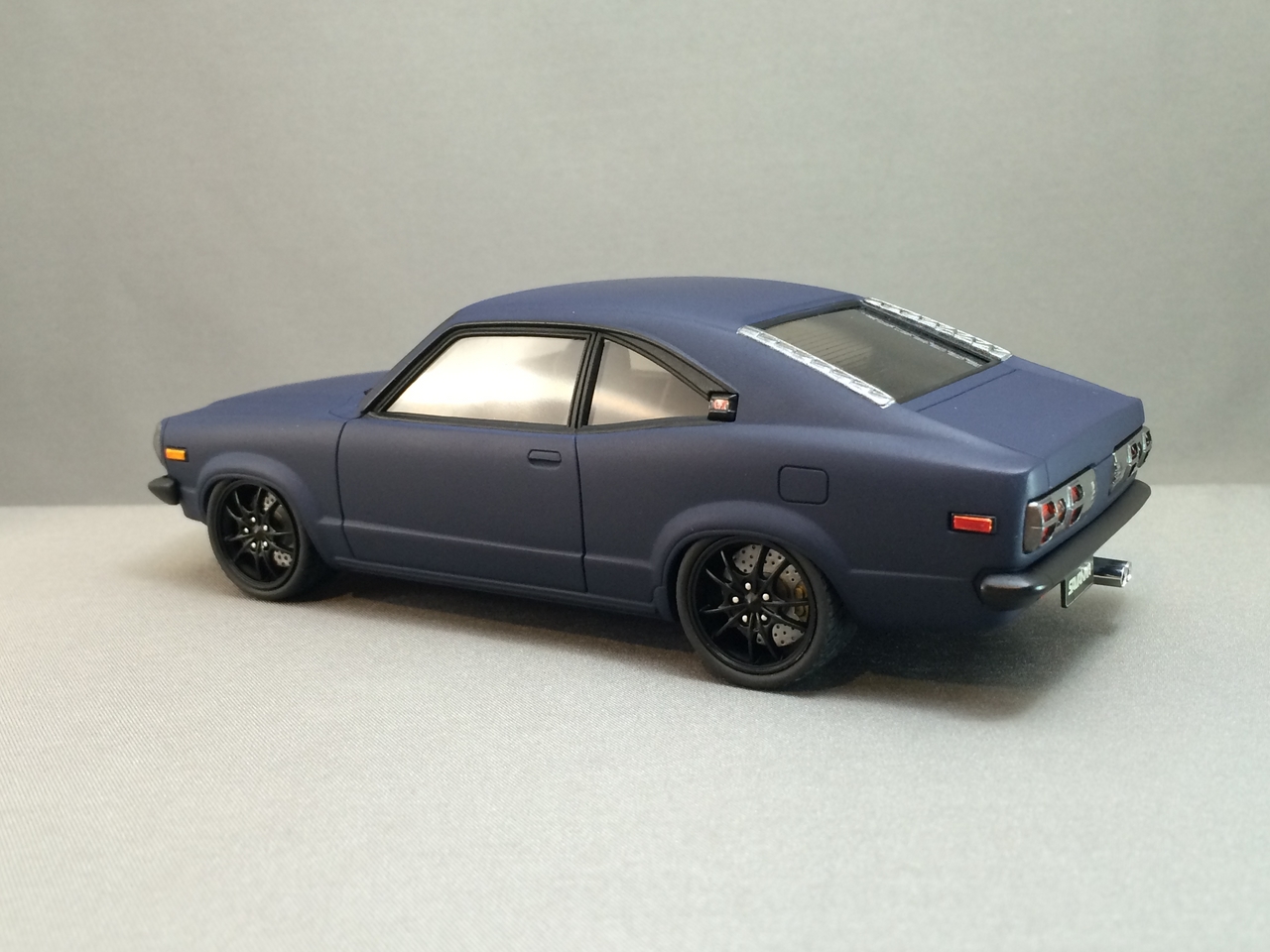 The kit is painted a flat dark blue and is sealed with satin clear. I found a picture of a similar era Toyota painted the same way and knew how I wanted the model to look. I was able to mount a set of Pegasus wheels by grinding out the wheel wells, inner and outer. The look of the new wheels gives the car a very aggressive look. The ride height is un-modified which was as very sweet surprise.