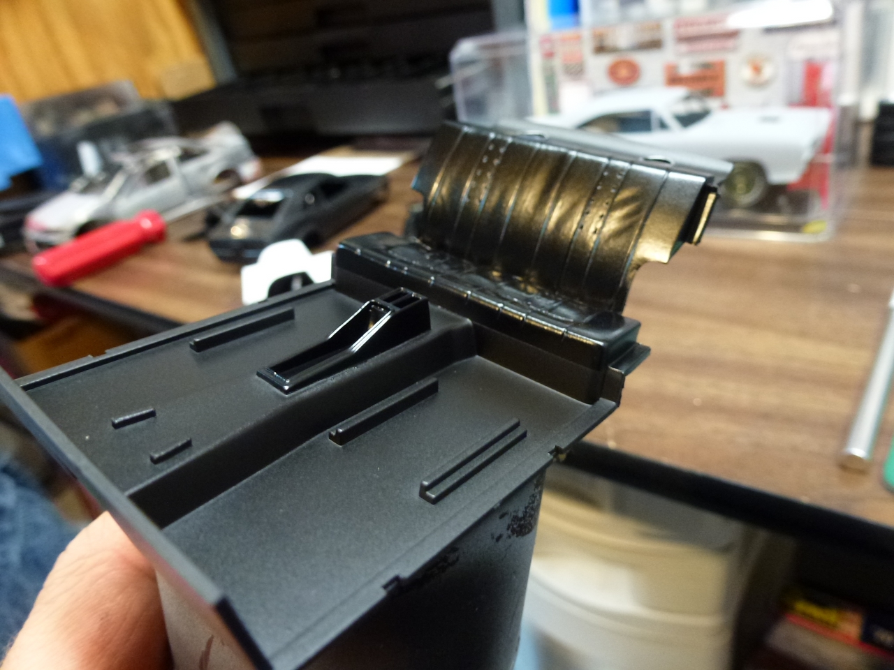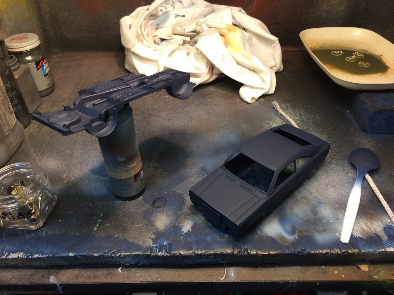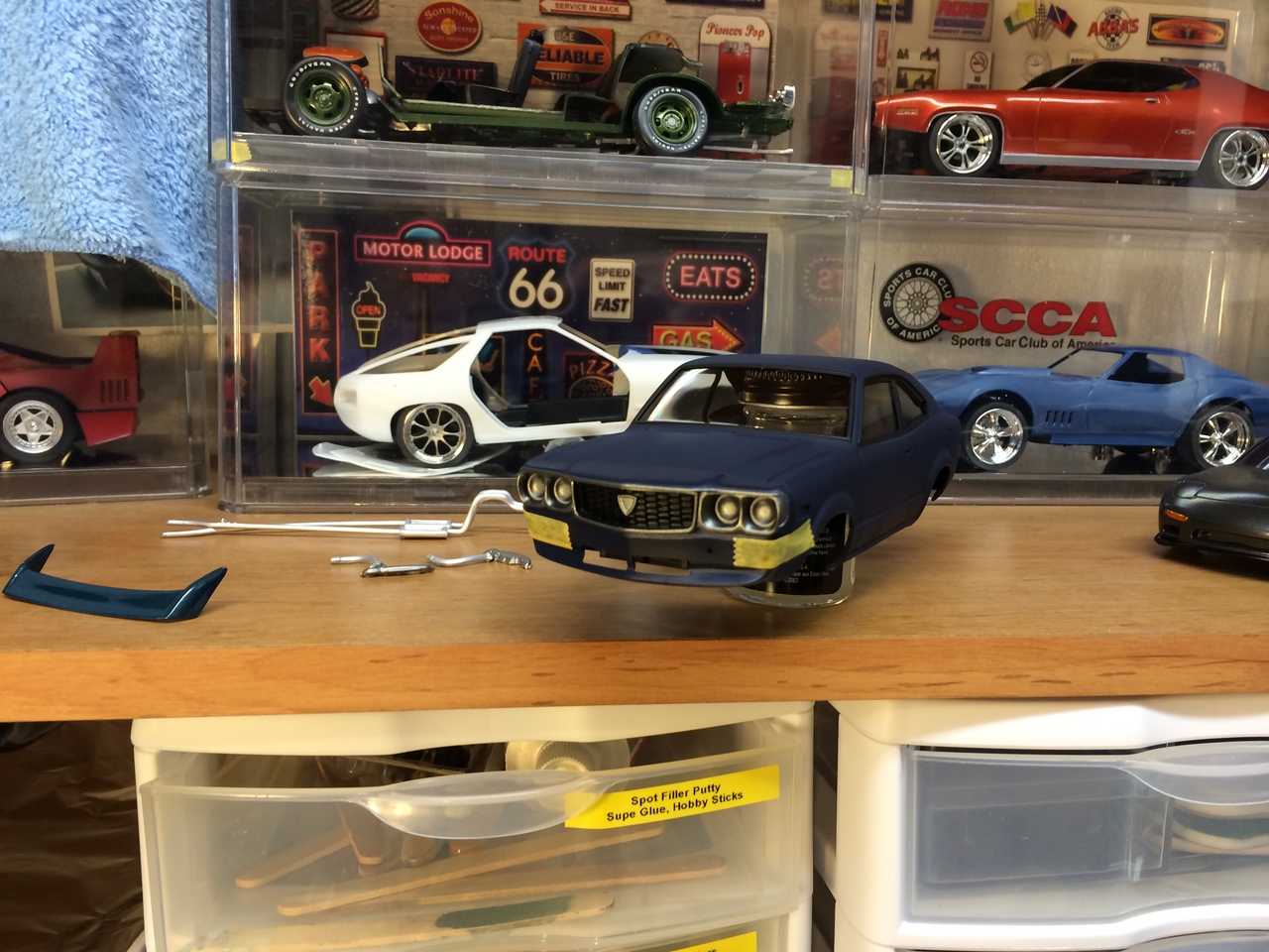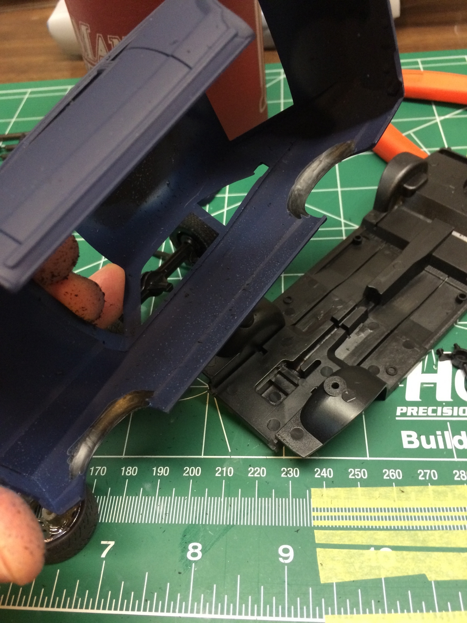 The kit is painted a flat dark blue and is sealed with satin clear. I found a picture of a similar era Toyota painted the same way and knew how I wanted the model to look. I was able to mount a set of Pegasus wheels by grinding out the wheel wells, inner and outer. The look of the new wheels gives the car a very aggressive look. The ride height is un-modified which was as very sweet surprise.