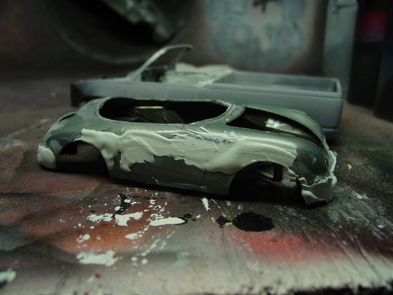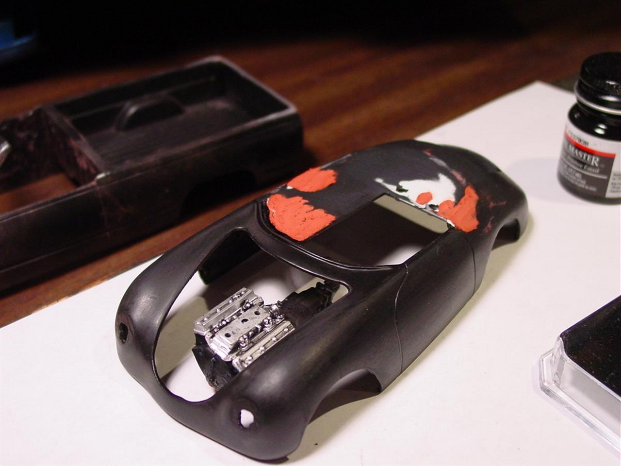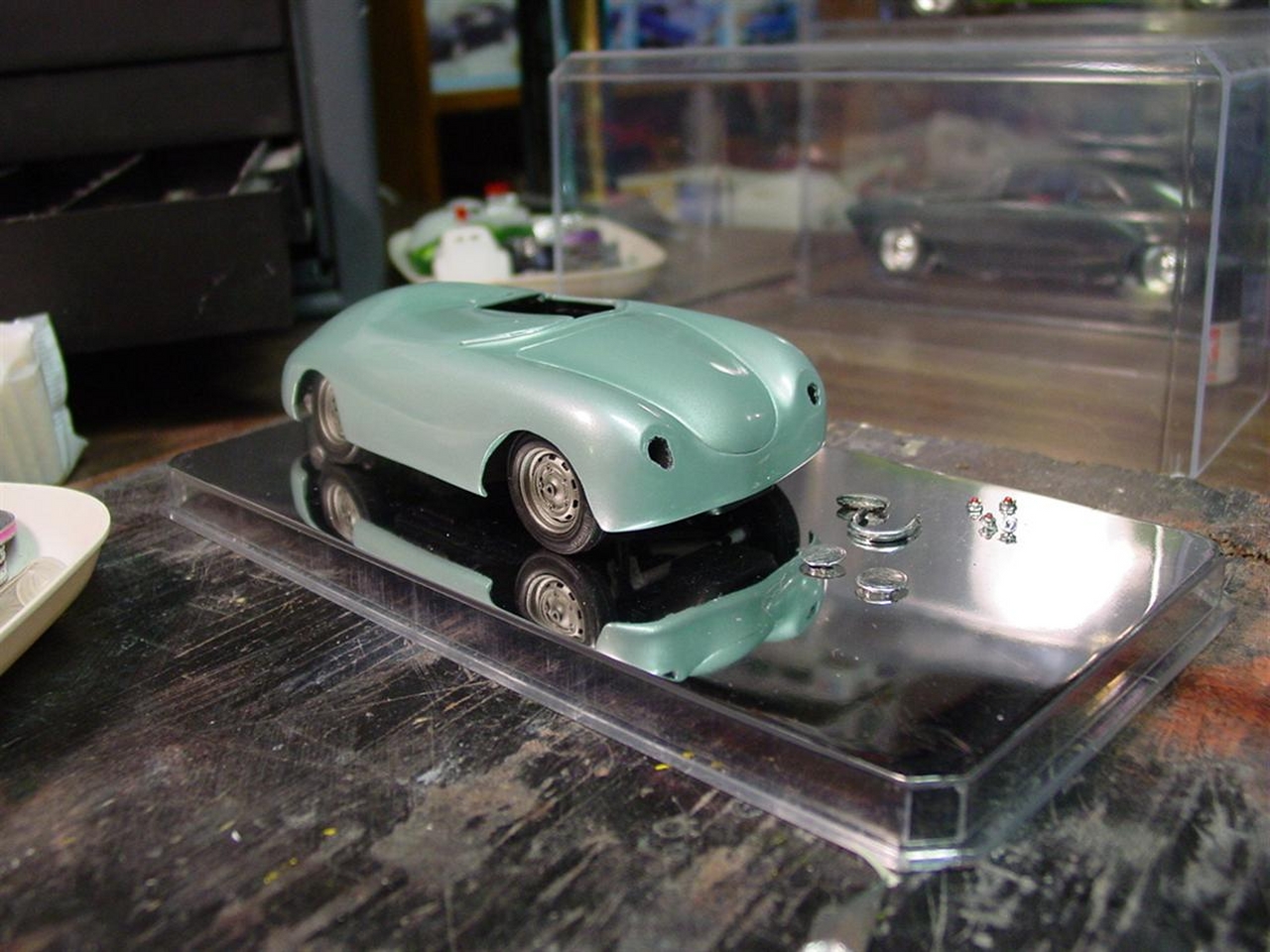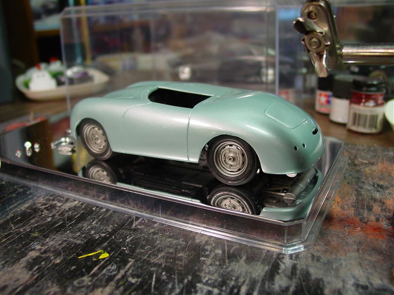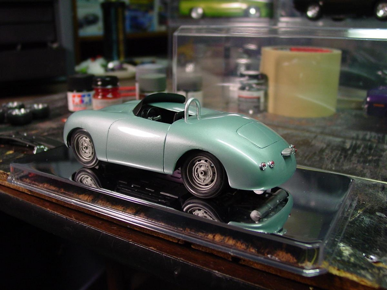 Once I get through a few projects, I’m considering a monster rework for this kit. Overall, it turned out decent, but I look at the lumpy wheel wells and the shrunken body filler and I find that I would like more from little Porsche. The picture with the V8 has been resonating with me and I have a feeling I’ll try something crazy. I have a Porsche 928 kit that is missing quite a few parts making nothing more than spare parts. Depending on what’s left, I may try to graft the engine, transmission and suspension onto this 356. Or, I have an LT1 engine or any number of old Mopars to choose from. I’d like to craft a somewhat realistic chassis to a reworked body that resolves the mistakes I’ve already noted. Time will tell!