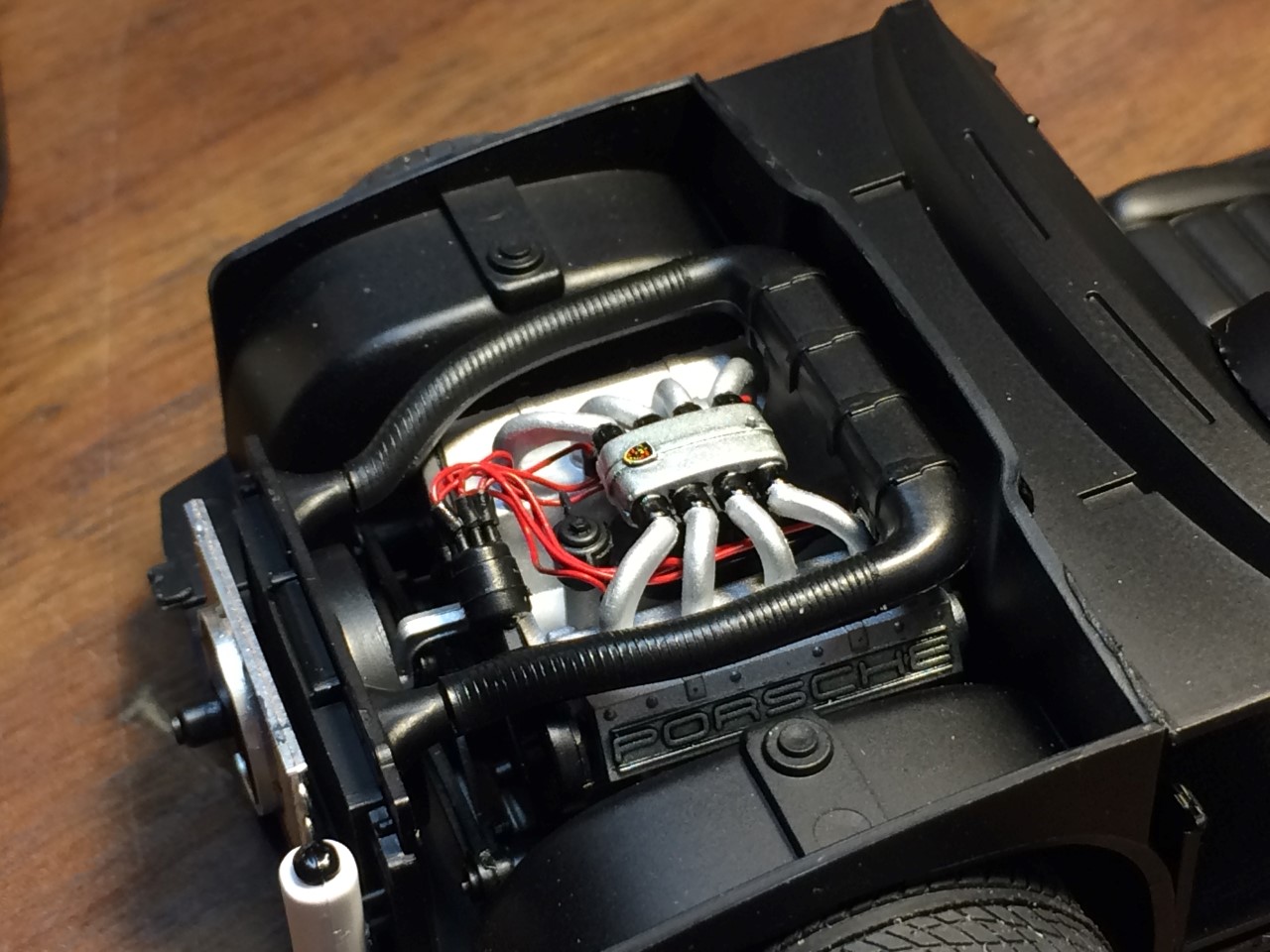 Once painted and cleared, the Porsche came together fairly well. I had trouble with the doors once installed. I chipped the paint on the leading edge and had to rework the opening. Once the doors were reattached, they opened and closed smoothly. I painted the indicators and other trim and attached them along with the exhaust. I always take the opportunity to install metal exhaust tips. I hand sanded the tips until I had the correct angles and polished them to a mirror shine.