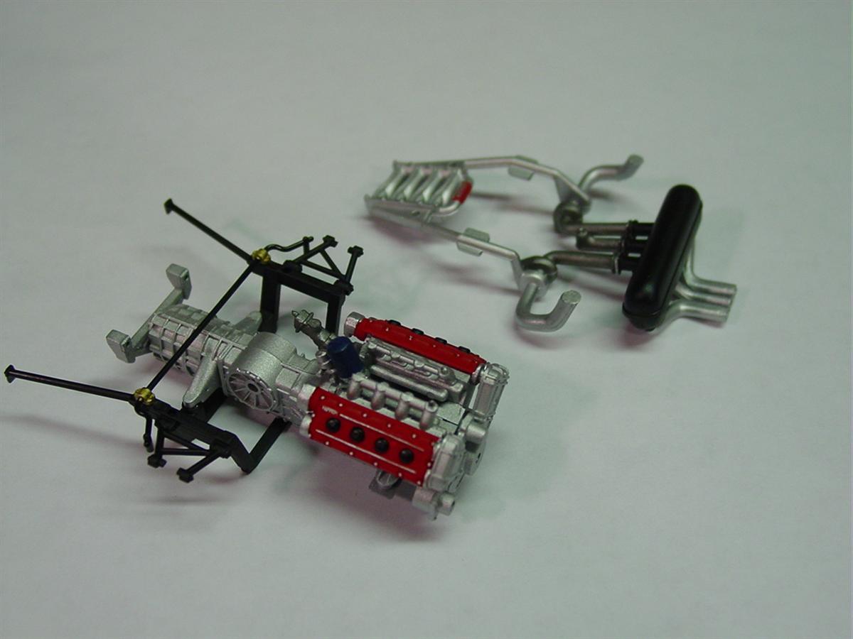 With the engine cover repaired, it was a race to the finish line. I attached the engine cover to the body, a challenge on its own due to the delicate hinges. I then married the body to the chassis for the last time and finished the engine compartment assembly. Before I attached the body, I had to address the fact that the exhaust pipes did not line up with the hole in the lower valance. I had to slowly heat the pipes with a heat gun and pushed them into place.