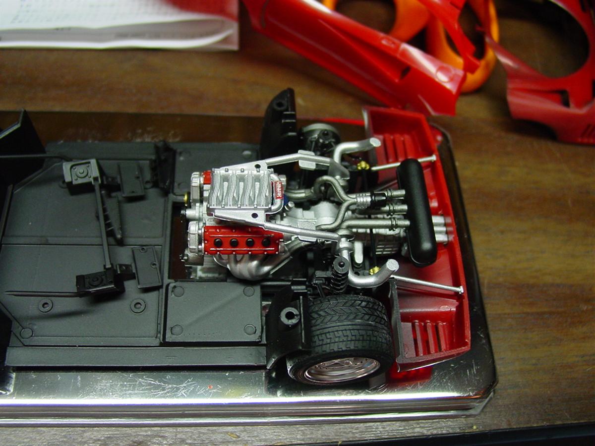 Now that most of the body detailing was complete, it was time to start final assembly. I decided to add plug wires to the engine even though they are almost impossible to see. What is important is that I know they are there! Wrapping up the engine build, I finished the intake manifold assembly by spraying the coupling red and using thin strips of bare metal foil to simulate clamps. after this, I glued the engine in place.