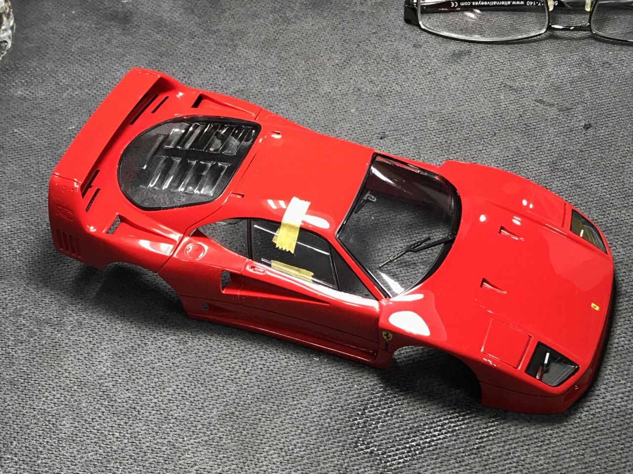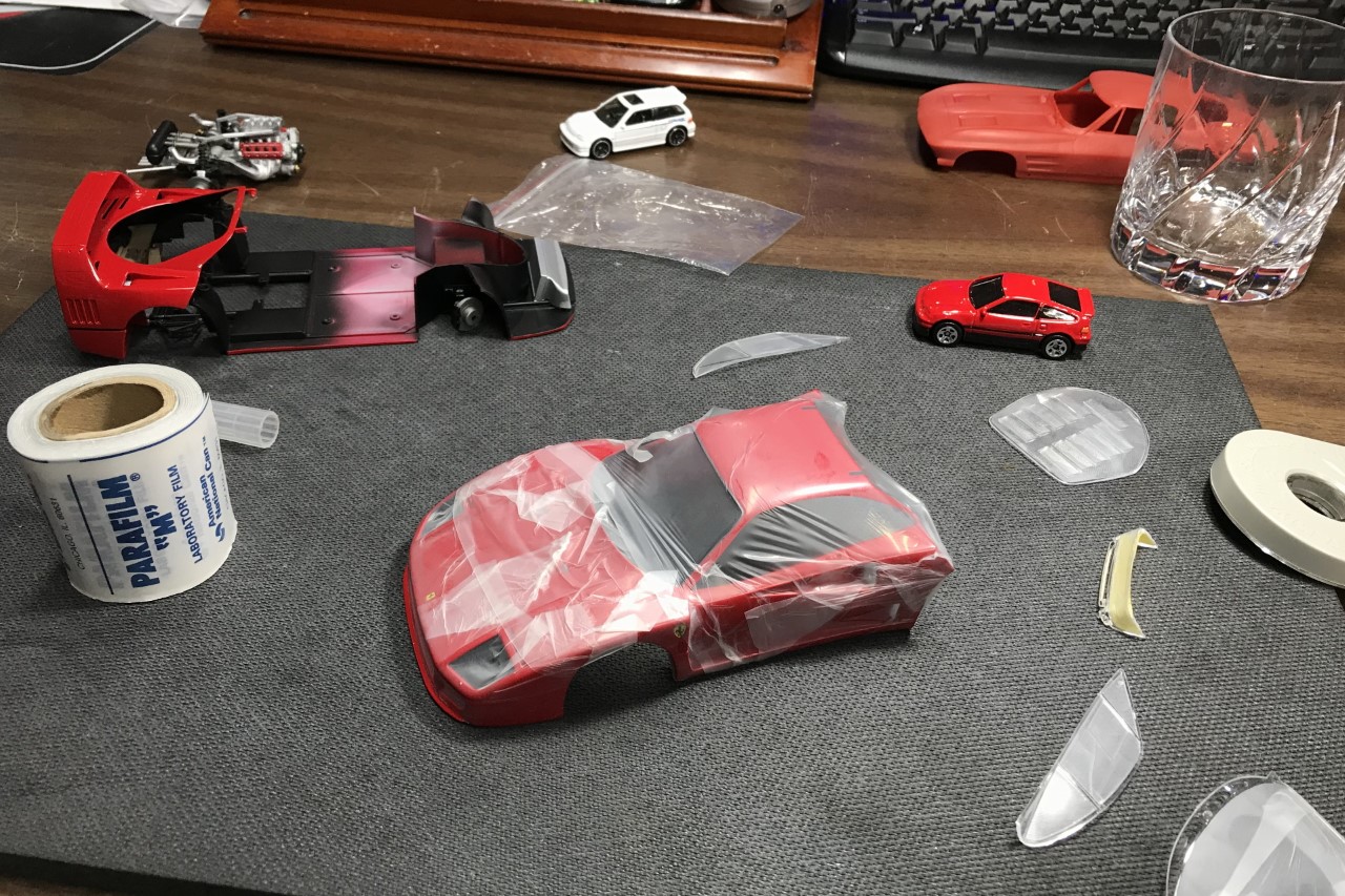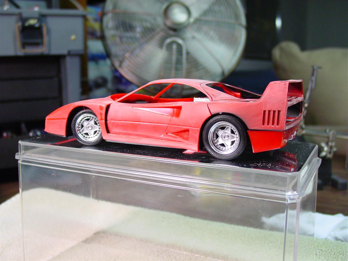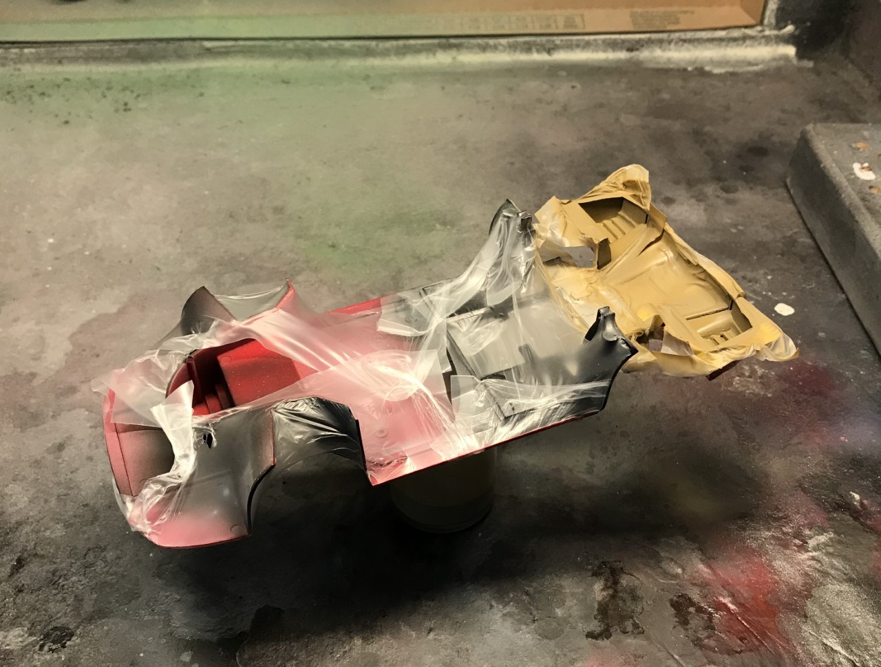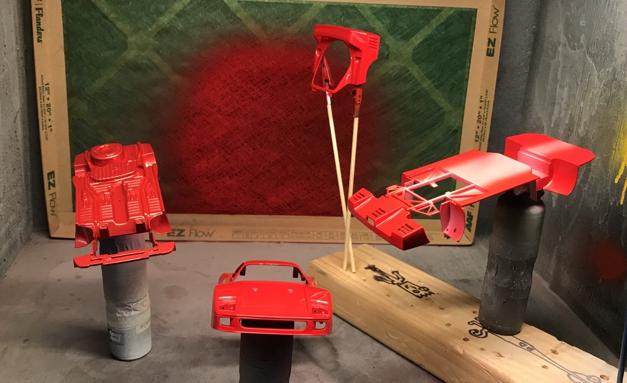 I started spraying the body in decanted Tamiya Italian Red. I found that the volume of paint seemed slow and decided to finish the color with paint straight from the can.
