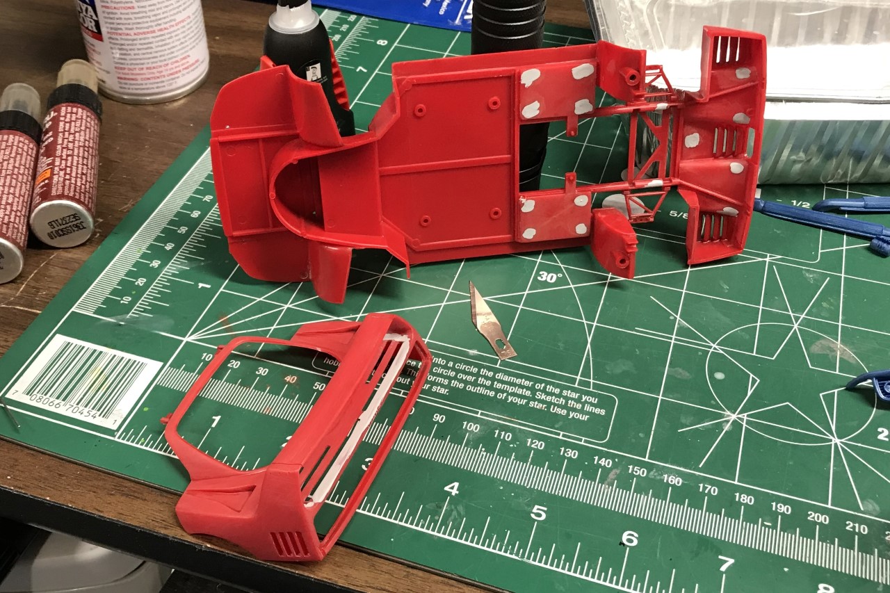 For what seemed like an eternity, I spent quite a bit of time working the sink marks since most of them would be seen. I had also read about how the engine cover would not fit correctly once completed. I worked on heating it and creating more clearance. More on that during final assembly. After scribing panel lines and finishing the body work, I sprayed the final coat of primer and it was ready for paint.