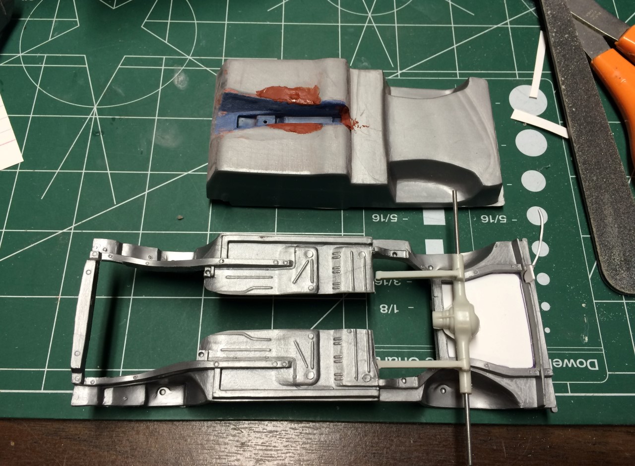 Once I finished the ornament, I started working on my hemi Charger project. I cut out the rest of the chassis pan and created patch panels. I also worked on straightening out a bit of bow in the body using brass strips and my dehydrator. It worked out relatively well.