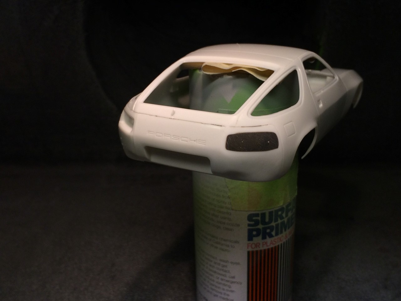 After reading about using JB weld for filler in Scale Auto, I decided to give it a shot. I bought the quick set version which takes a few minutes to firm. Full cure still takes about four hours. The author claimed that JB weld does not shrink as so many other fillers tend to do. I used a junk 928 body and filled in one of the tail lights. The deep pocket will give me a chance to see if the filler shrinks.