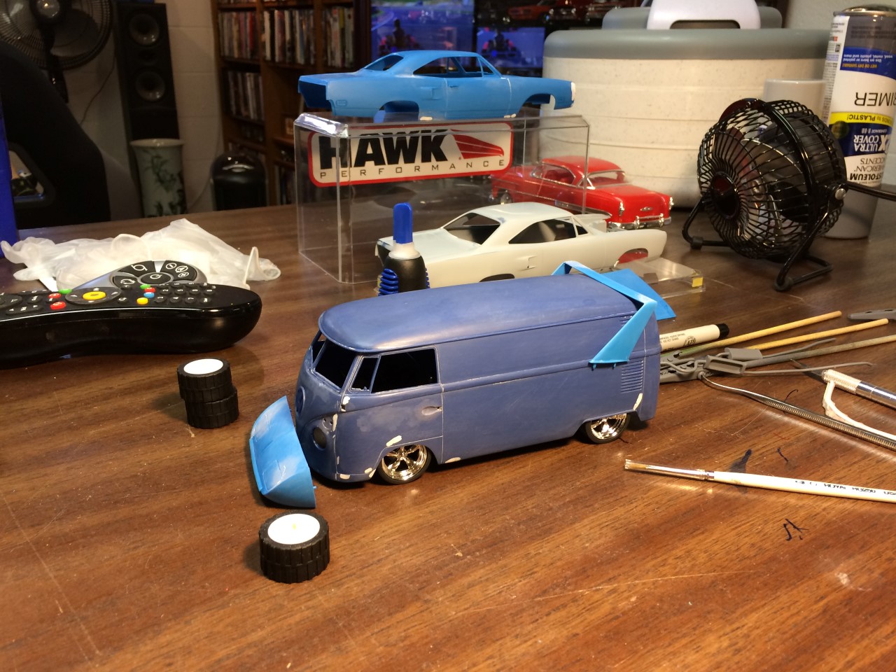 The VW bus is stripped back to bare plastic and ready for another round of body work.