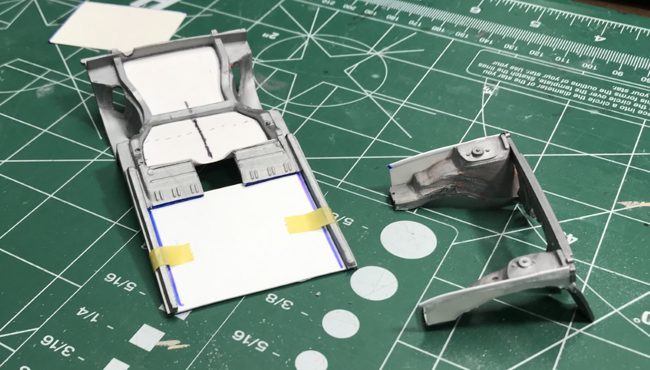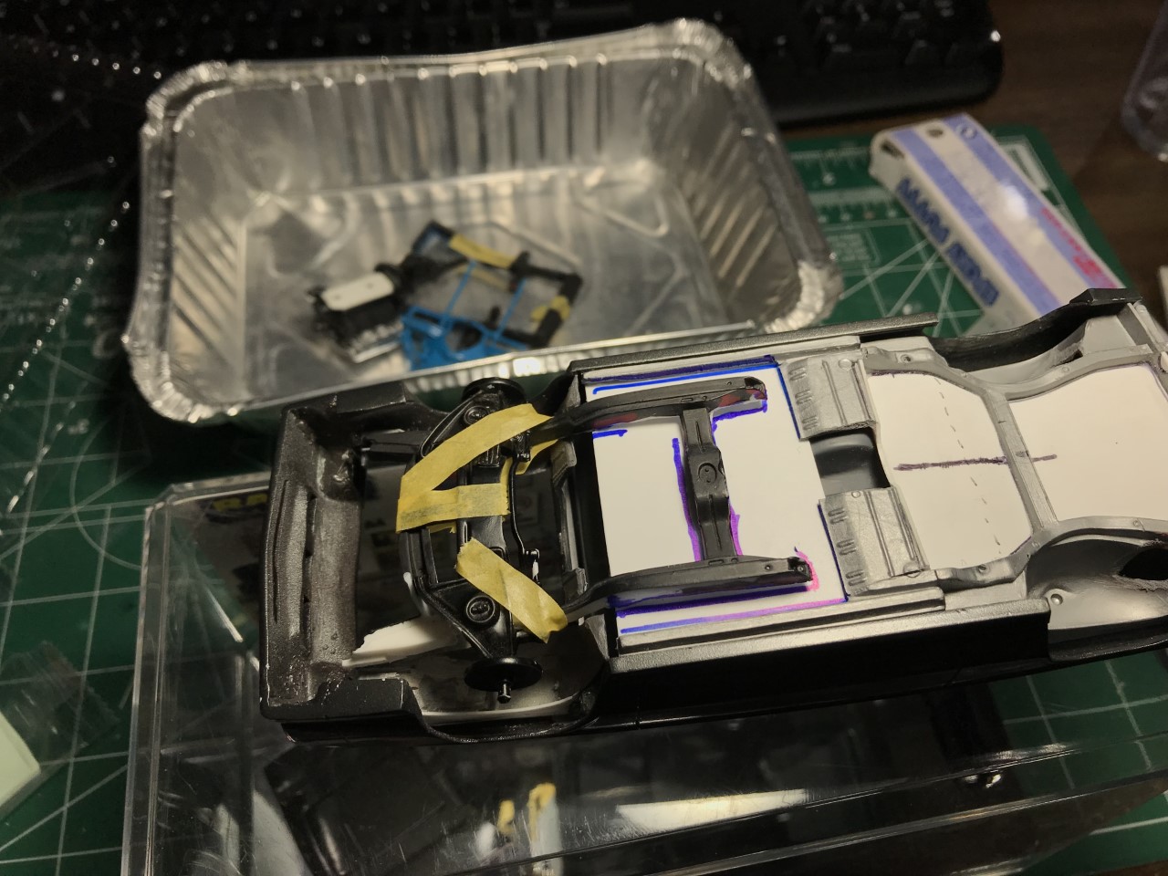 I decided to remove most of the floor pan and create a new one from sheet styrene. It would give me a cleaner slate to attach the new sub-frame. I used one solid piece to replace the floor pan and cut out the transmission tunnel. Once that was done, I use plenty of tape to hold everything in place while I ensured proper fit in the charger. After marking it, I pulled the tape and glued the sub-frame in place.