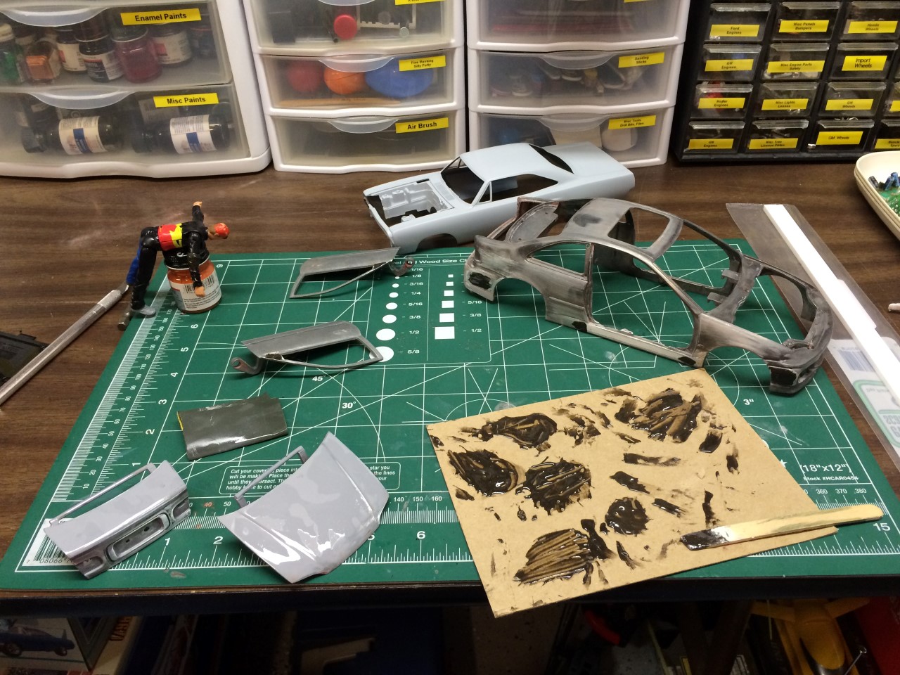 March followed the trend of last month. Still reeling from having to strip the VW bus, I continued working on other projects. The 70 Superbird chassis and engine were completed. I dusted off my wildly long term diecast Civic project by grinding off the last of the previous paint attempt and reworking some of the body work.