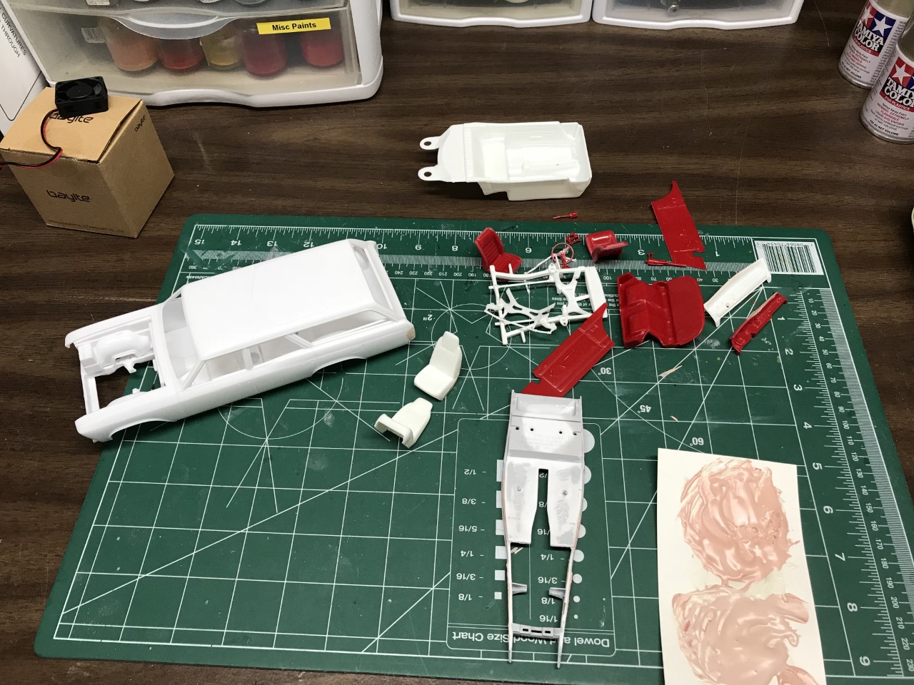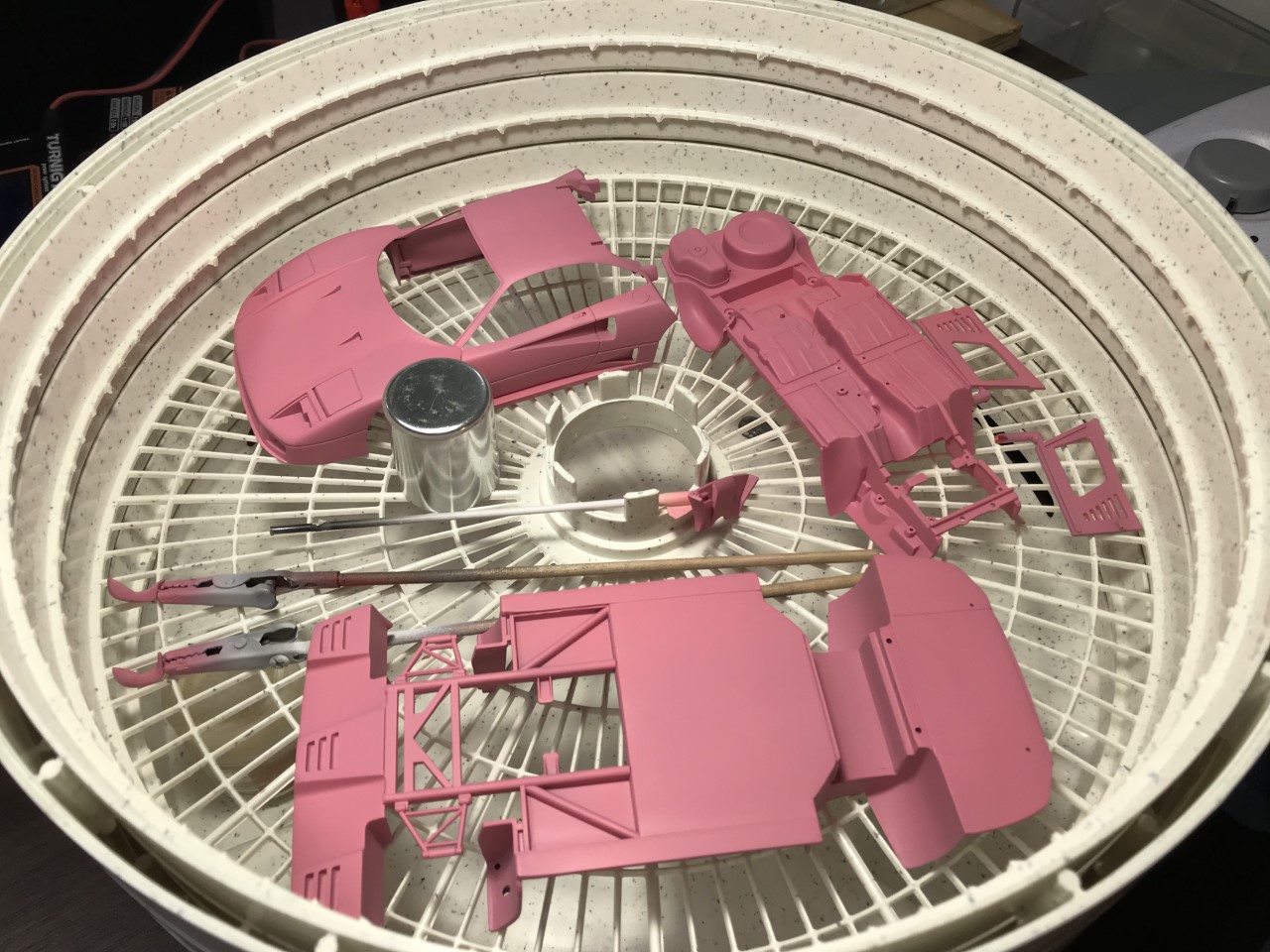 I still managed to get in a few nights of work. I tried out my new Zero Paints pink primer. I learned a little too late that “thinned for airbrush” doesn’t mean the same thing to everyone. After fighting with spitting and poor coverage, I thinned the mix and finally got the flow I was looking for. The only problem I ran into was heavy spitting on the engine cover of the F40. It filled in the embossed F40. I decided to strip the engine cover and start over.