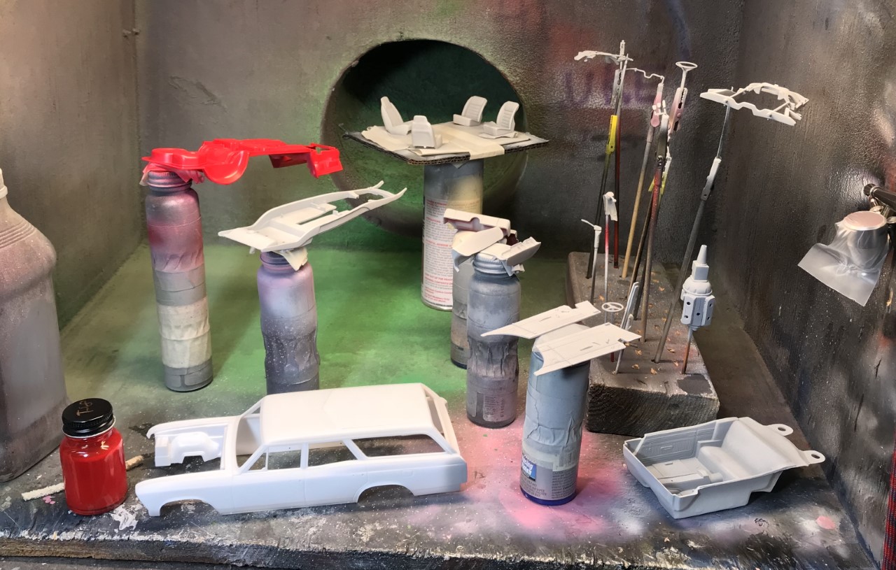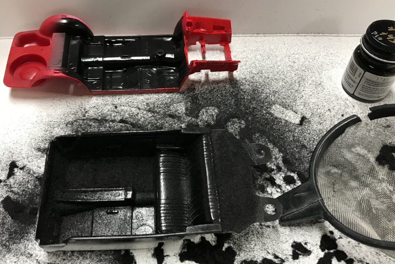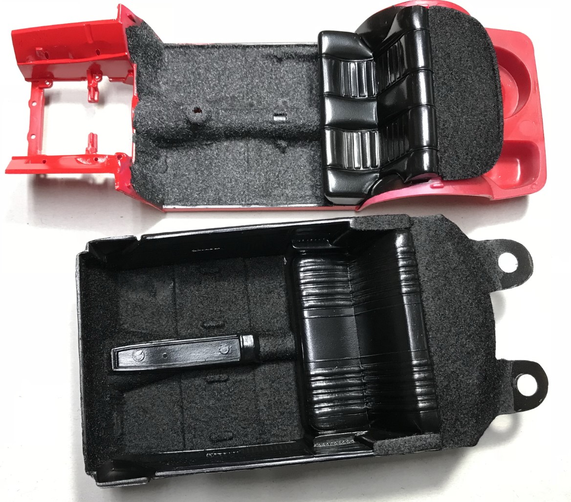 Beyond that, I started the interiors for the Alfa Romeo and the 70 Superbee. The chassis pan for the Alpha is also the bottom of the interior. I first finished the chassis in body color then worked on the interior itself. I flocked the interiors of both cars and prepped several parts.