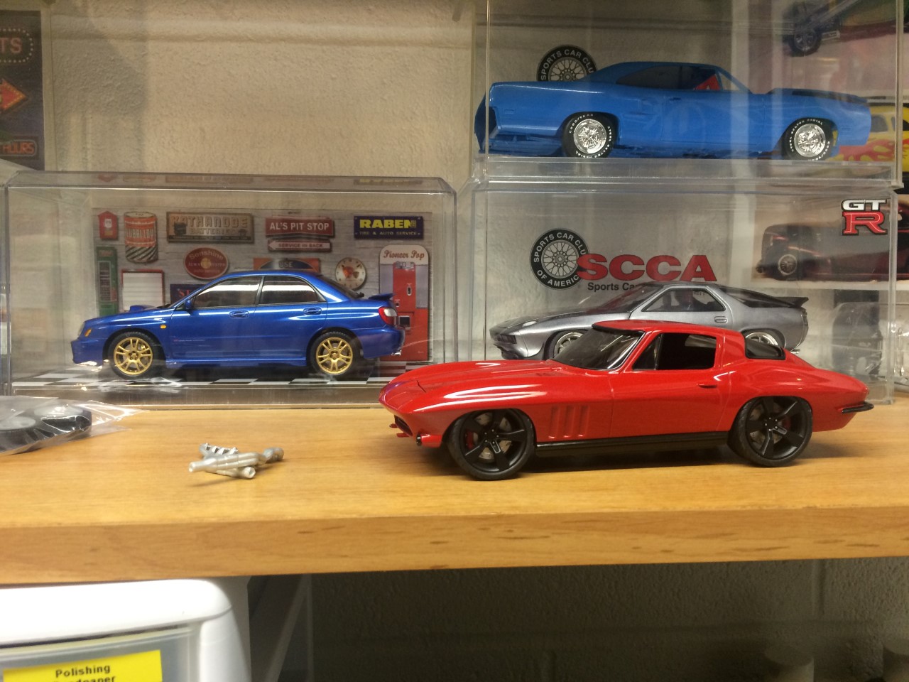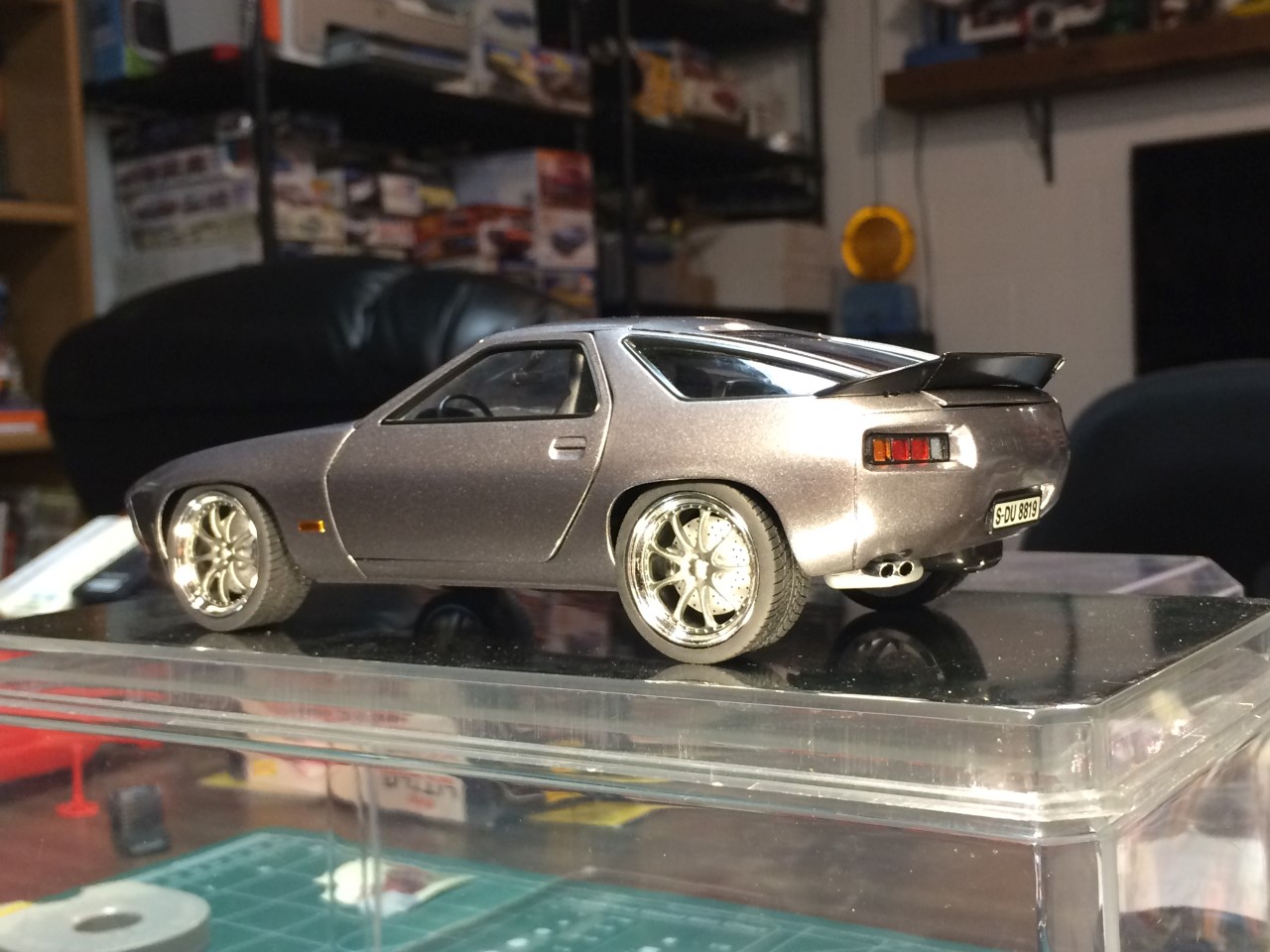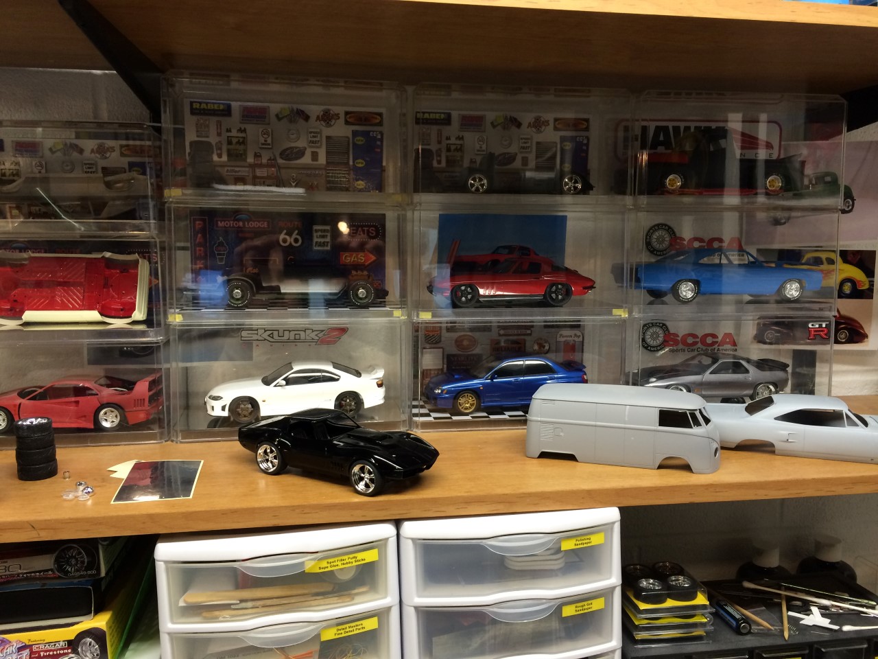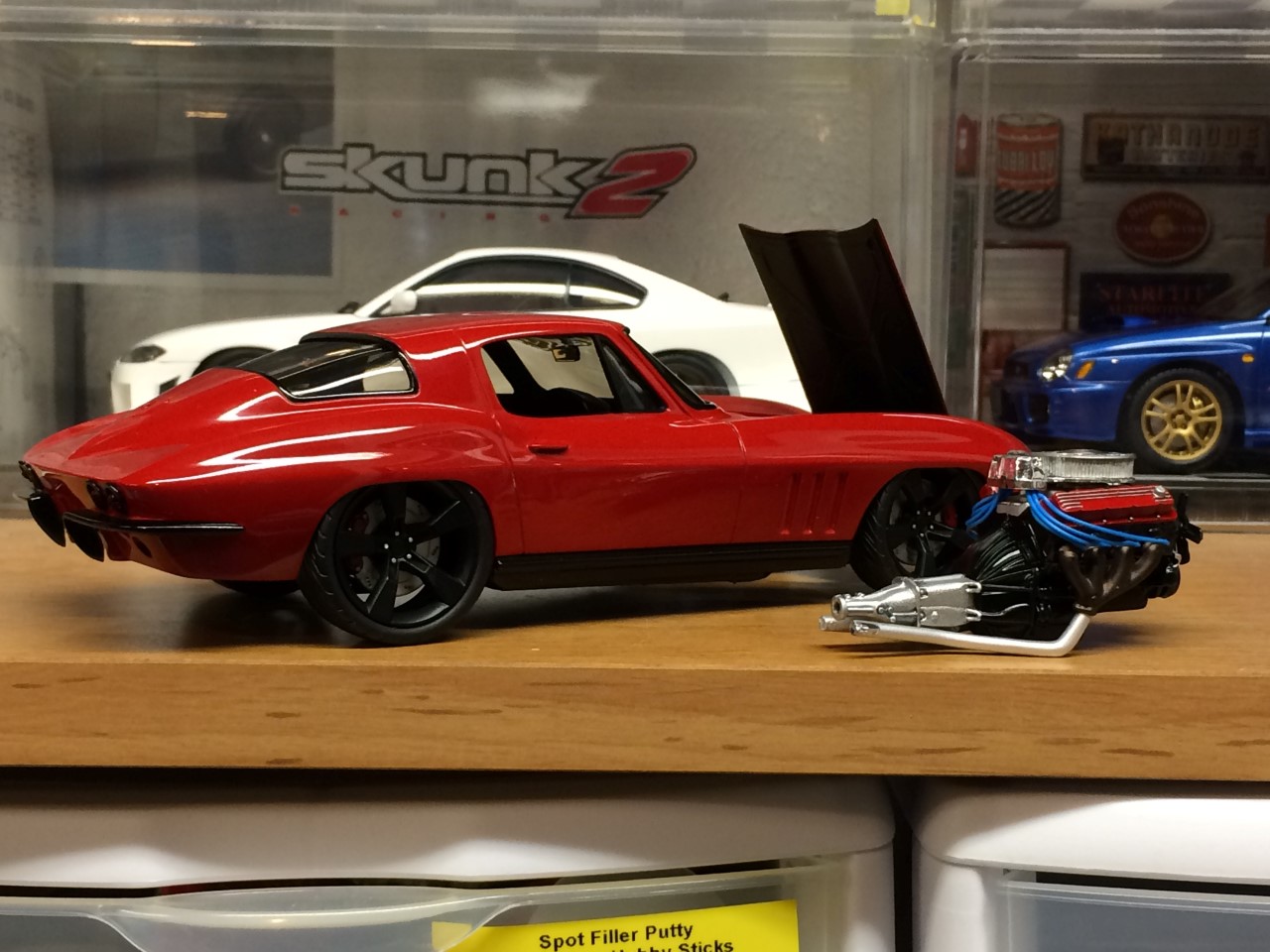 I’m happy to say that I’ve been fairly productive this month! I was able to finish the ’65 Corvette and 928 Porsche projects. I was made progress on the ’68 Corvette. I finished detailing the engine including plug wires as well as set the ride height and attach the suspension. Wrapping up the month, I finished the body work on the VW bus and started spraying color. See the pictures for more details.